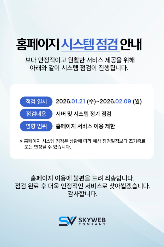 스카이웹컴퍼니 ㅣ 대표자명 : 심예람 ㅣ 사업자등록번호 : 481-17-02904TEL : 010-2442-7313 ㅣ E-MAIL : info@skywebs.co ㅣ 경기도 파주시 금빛로 18, 803-비38호(금촌동, 드림타운)